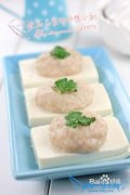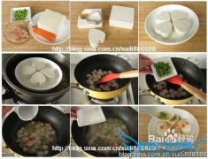 详细操作豆腐用刀横批为二,用模具压出心形状,放入盘子入蒸锅,水开后蒸5分钟;关火取出倒去汁水,胡萝卜切丁;虾仁用水淀粉上浆后入热油锅煸炒;倒入胡萝卜和青豆...