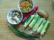 详细操作原料图如图。姜磨泥,葱切末。日本豆腐切段。杂菜,海鲜,火腿,一起焯水捞出。锅里放半汤匙橄榄油,或者葵花油等味道比较浅的食用油。炒香姜末和葱花。倒杂...