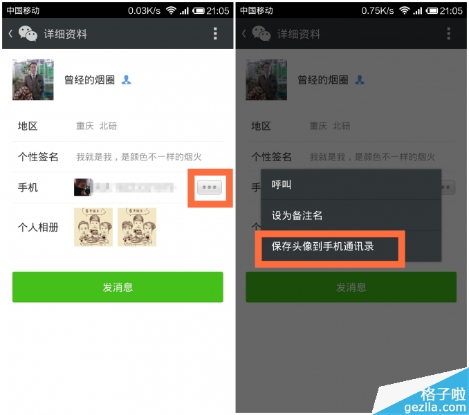 如果你的微信好友同步了通讯录,进入他的详细资料,点击手机号码后面的菜单,就可以保存头像到手机通讯录了