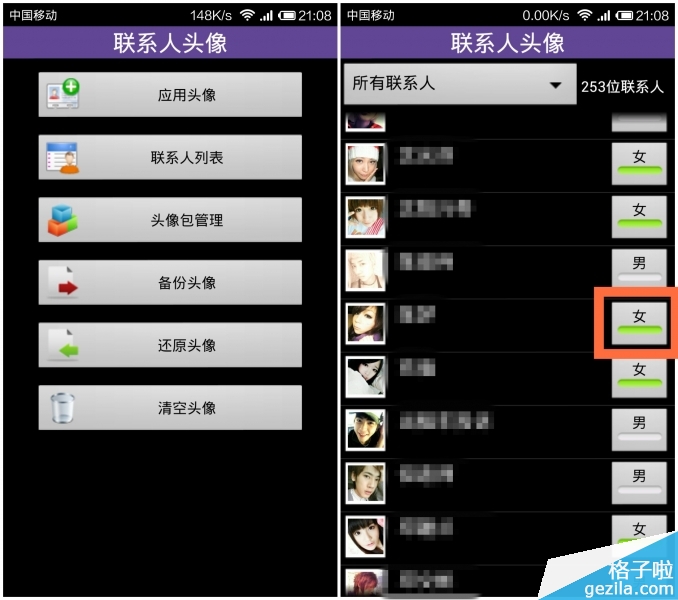 打开该软件,联系人列表,手动选择通讯录里,哪些是女性,哪些是男性(设置一次就够了,软件会自动保存)