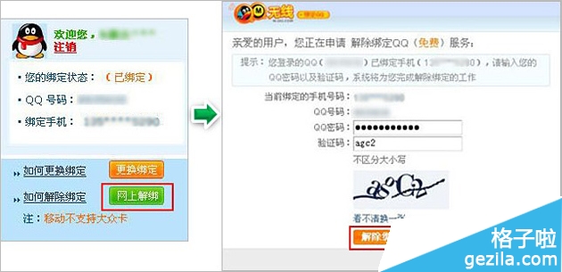 进入绑定网页登录QQ号码后(请点击这里进入网站),点击“网上解绑”按提示操作,按提示输入“QQ密码”及”验证码”,点击“解除绑定”即可解除。如下图: