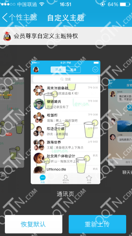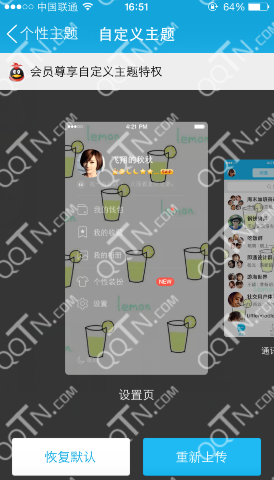 2、在个性主题里,我们可以看到自定义主题栏目,需要注意的是该功能仅限QQ会员使用,进入以后,可以看到设置页、通讯录、聊天背景三个板块,选择上传背景图片;