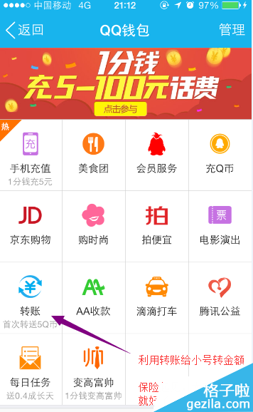 1、进入QQ钱包转账功能,给小号转账,小编这里转1元,你们可以转0.01元;