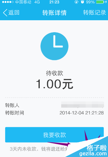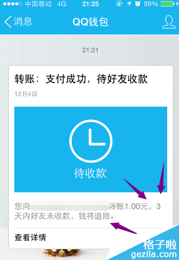 3、转账成功以后,下面会有提示好友3天如果不处理,钱自动退回。如果不安心的话,我们马上可以切换到小号,退款。