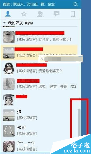 2、在我的好友列表界面,我们可以看到右侧有一个下拉滑块,我们直接将滑块下拉到最低端;