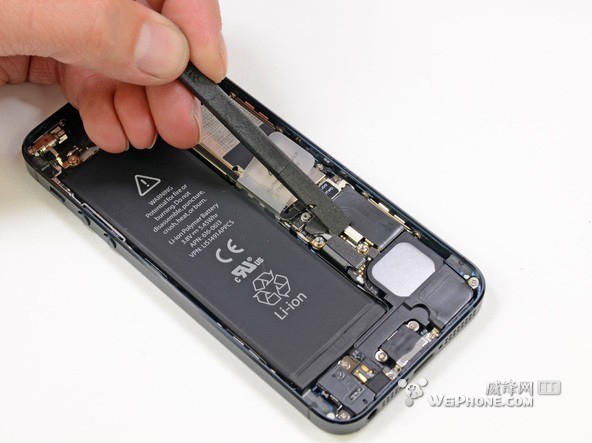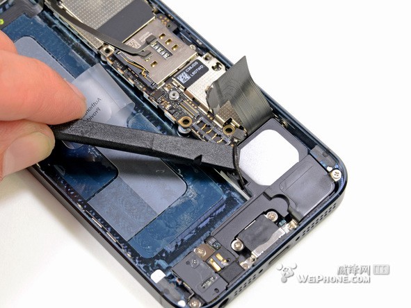 说到天线,位于电池旁边的天线连接器一端很容易从主板撬起来。这个位置的天线在iPhone 4S是蜂窝网络的天线,但是在iPhone 5不知道做何用处,要等进一步拆解才知道。