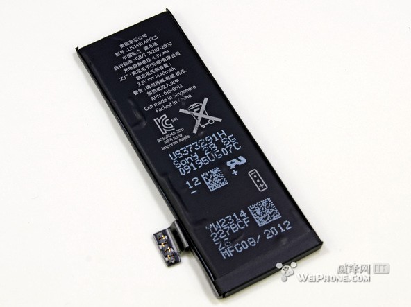 八,我们用扁平的撬刀将电池撬出来,电池用了粘合剂来固定,典型的苹果作风。iPhone 5 的电池也做了改进,电压更高,电池容量更大,我们来做个对比: