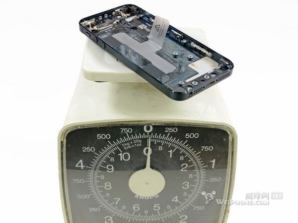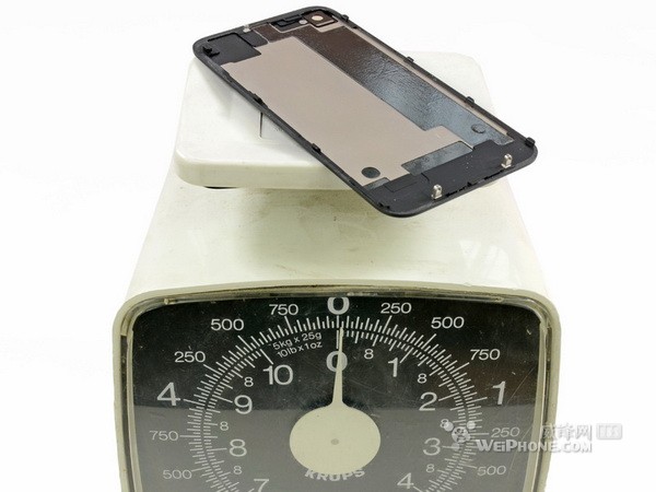 十九,虽然还有几个零件没拆,但是掂量了一下后背壳,还是能感觉到很轻。具体有多轻,我们用精确度很高的设备称了一下,整个后背壳只不过比iPhone 4S的背面玻璃重那么一点点。