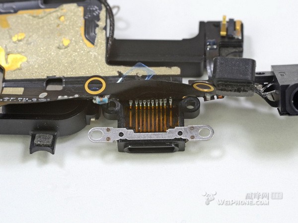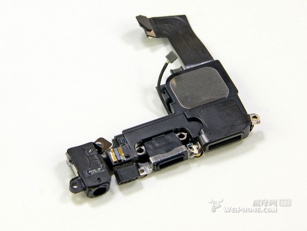 十八,解剖完主板后,我们将目光转向后背壳。接下来拆Lightning底座接口组件,包括耳机孔和扬声器。看这部分零件,苹果是不得不缩小底座接口,显然这个组件容不下30-pin的底座接口。底部的麦克风挤在耳机孔和Lightning底座接口之间,躲在第二个扬声器孔后面。