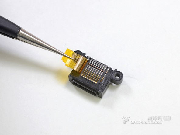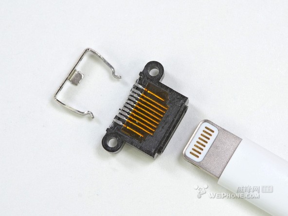 下面我们近距离地看一下这些零件,我们可以清楚地数到底座接口的确是8-pin,虽然苹果官方没有详细解释,但其中两针是用于供电和接地,其他6针还不知道什么用处。