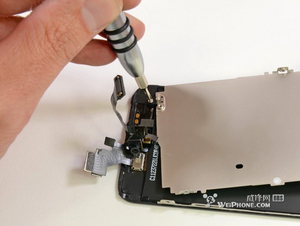 五,屏幕连接器用好几枚螺丝钉紧紧固定到主板。拧开螺丝钉,用挑线器就能很轻松地将屏幕连接器挑拨开。屏幕如此轻松就能拆出来,再一次想起3GS的拆解。