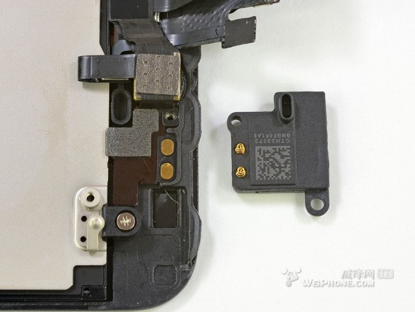 二十一,听筒是两枚螺丝钉和连接器跟屏幕集成固定起来,中间隔着弹簧。iPhone 4S 的扬声器本来是粘贴在脆弱的电源按键排线上,需要很细致才能拆出来。iPhone 5的扬声器从屏幕集成轻松一按就弹出来了,又一个容易维修的体现。