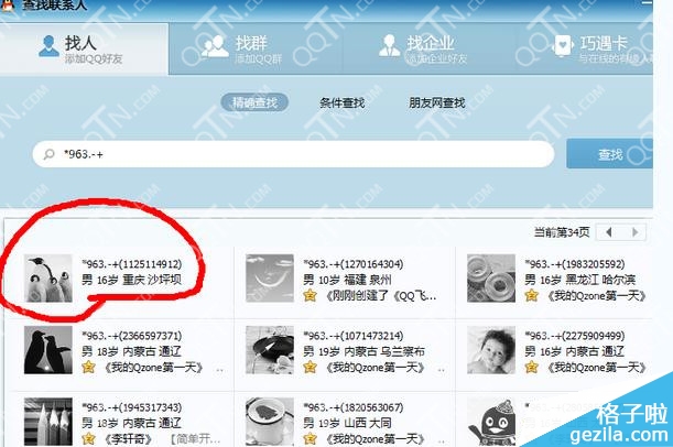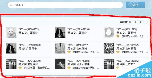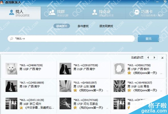 1、首先,我们进入查找联系人当中,在QQ查找栏里面输入“*963.-+”,会显示除很所类似的名字的QQ号码,如图:
