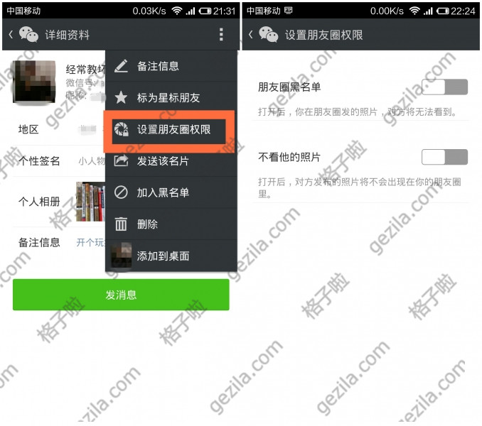 不想看到有些好友的朋友圈动态!二货每天刷屏,老在朋友圈发自己的自拍照, 或者一些得瑟的吃货,总把自己吃的美食分享到朋友圈, 要么就是不停转发各种老掉牙的心灵鸡汤.是不是很烦呢?你又不好意思拉黑他? 你可以选择在朋友圈拉黑那些”讨厌鬼”哦!联系人右上角菜单-设置朋友圈权限。