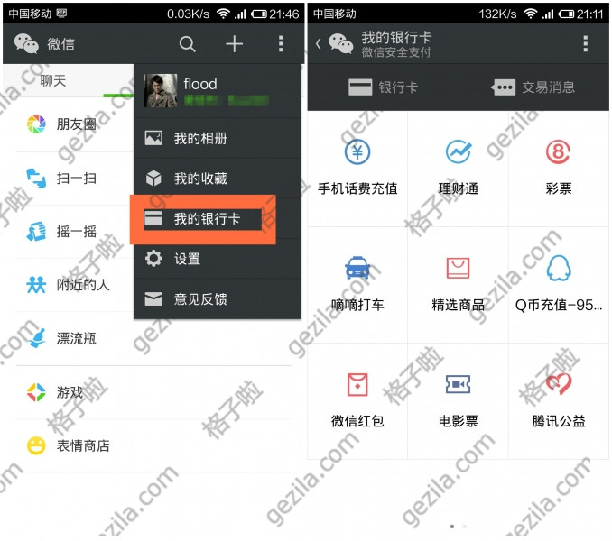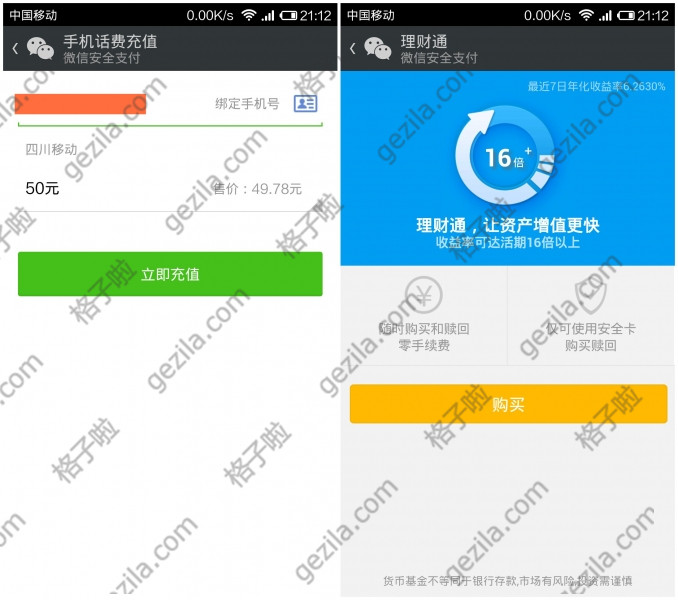 手机微信充值及理财通(相当于淘宝的余额宝,利息差不多)。