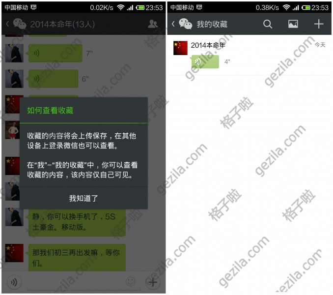 和朋友聊天时,希望收藏一些重要的语音、图片、文字,以待夜深人静的时候重温一下!长按信息--收藏,在我的收藏里面就可以看到。