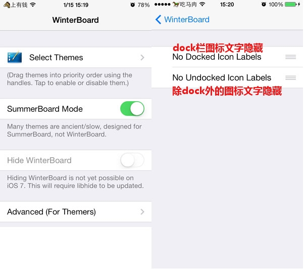winterboard安装完成后,点击进入Select Themes进行设置,不过其原生的主题效果较少,新版只有“隐藏非dock栏图标文字”和“隐藏dock栏图标文字”两种,小伙伴们可自行选择,然后按home键返回主界面,手机就会自动注销实现相应的效果。