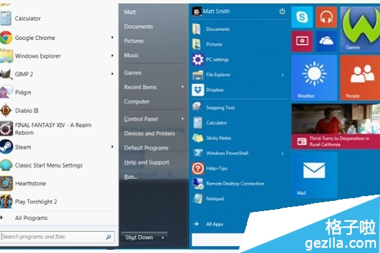 而即便忽略掉动态磁贴,开始菜单看上去依然不对劲。在默认下,它的色彩会根据系统主题而变化,但这同时也是Windows10当中唯一会适配系统主题的菜单。把它和Windows7直接对比你就会发现,后者仅更易阅读,同时也显得更加紧凑。