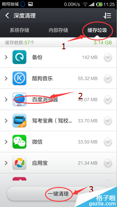 8、深度清理的界面,先点下《缓存垃圾》,然后看个人需要,那个软件的垃圾用清理就在后面打上对号勾,最后点《一键清理》就可以了