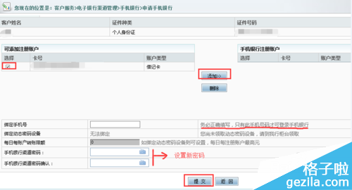 6、分别添加账户,绑定手机号,重新设置手机银行密码。