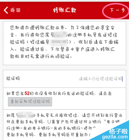 3、在验证码框输入手机发送给你的验证码,点击“下一步”,此时开通成功,你点击“继续完成交易”。进入转账汇款界面,选择下面的“跨行汇款”。