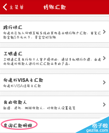 6、你的汇款信息可以在你的汇款明细中查询,查询的方法是,进入“转账汇款”,在下面找到“查询汇款明细”,选择“汇款类型”,类型选择跨行汇款。