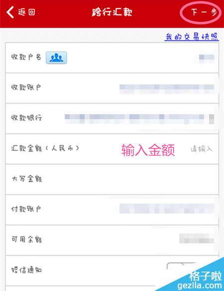 4、输入你的收款户名(姓名),收款的账户账号,以及收款的银行,金额,输入完成点击“下一步”。进入下一步后,再次“确定”。