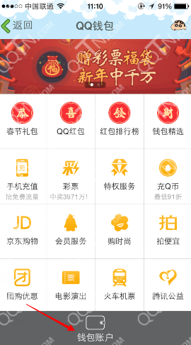 2、在QQ钱包的最下方,我们就可以看到钱包账户,点击进入;