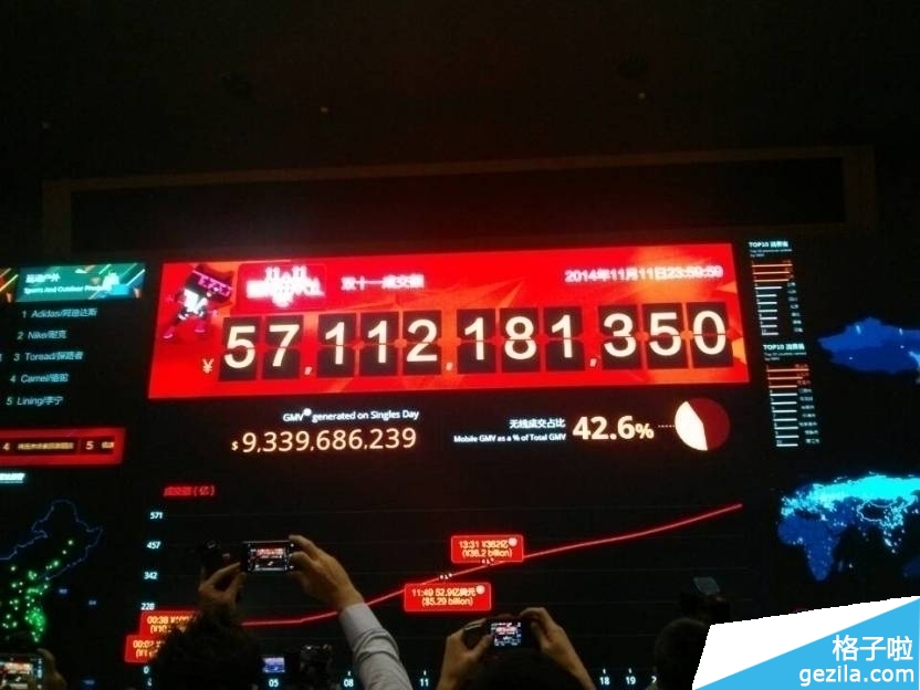 00:05 揭晓啦!阿里宣布双十一全天成交额571.12亿元,移动占42.6%。