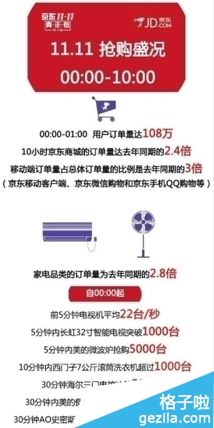 17:39 截止下午四点的数据,京东商城11月11日0:00-16:00,京东商城的订单量是去年同期的2.3倍。12时49分,京东商城的当日交易额已经达到去年11月11日全天的交易额。移动端(包括京东移动客户端、京东微信购物和京东手机QQ购物等)订单量增长迅猛,占总体订单量的比例达40%。