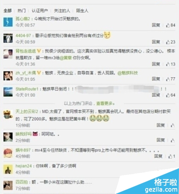 09:31 魅族此前表示双11魅族MX4 现货发售,金色版、银翼版各10000 台,下单即发。但双十一魅族却表现的备货不足,有网友吐槽称魅族此前一直宣称0点开售,但在天猫聚换算上却是一点开售,更夸张的是一点开售一点下架。现在去@魅族科技 的微博看下,发现评论全是酱紫↓