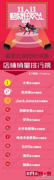 截止北京时间1点整,店铺销售排名前十的是小米、优衣库、杰克琼斯、韩都衣舍、华为、太平鸟、林氏木业、GXG、海尔和魅族。