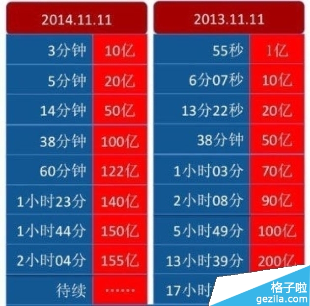 02:59 2013年、2014年双十一数据对比图(@鬼脚七的2014)今年天猫在38分钟时已破百亿,而去年却用了5小时49分。双十一开战后的两个小时,天猫的销售额已经达到了155亿元。