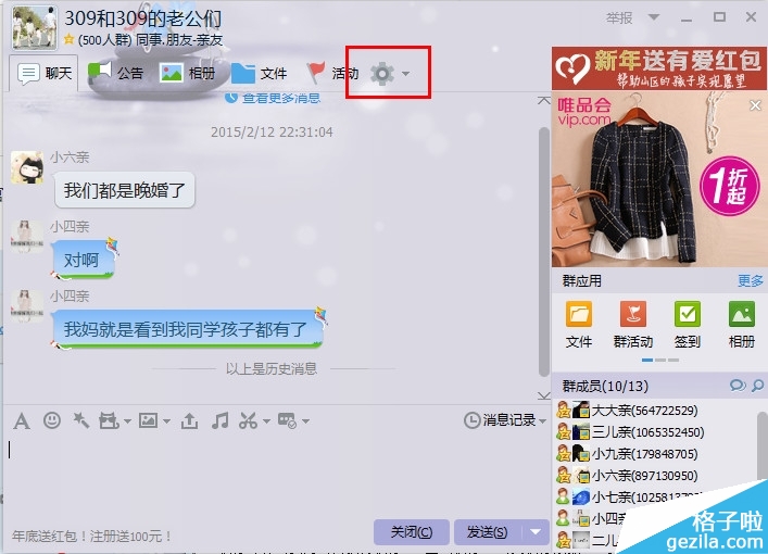 进入群聊页面,看到齿轮设置按钮,点击打开之后,点击成员就可以查询成员以及自己的等级积分。