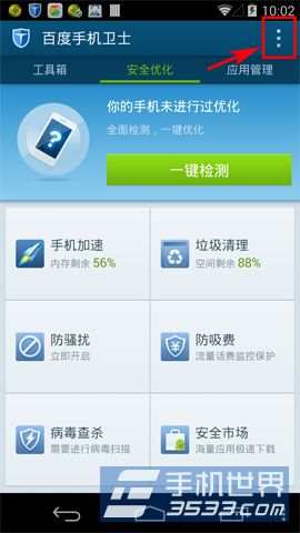 1)首先打开百度手机卫士,在进入首页,点击“三点”按键。(如下图所示)