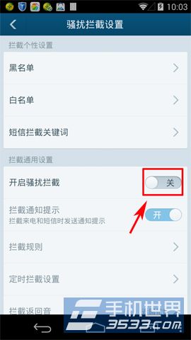 3)在进入防骚扰设置界面,点击开启骚扰拦截的开启按键即可。(如下图所示)