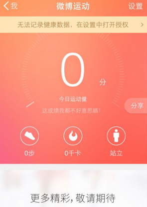 3、点击微博运动如下图,会看到提示“无法记录健康数据,在设置中打开授权”,这个提示表示还没有在ipohe的健康中授权数据同步到微博。