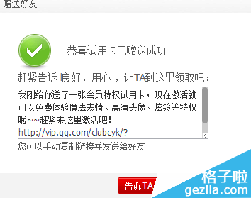 4、会员试用卡已赠送成功,将连接复制给你的好友,让他在这里激活即可成功体验7天会员哦!