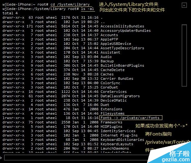 如果看到Fonts文件夹后面有"->"指向/private/var/Fonts就表示成功。