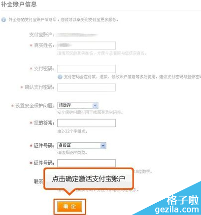 7、按照上述图片上的提示,点击“点此激活”。填写支付宝账号的相关信息。点击确定,则新注册的淘宝账号就和支付宝账号绑定。