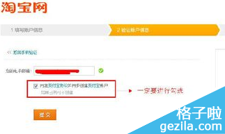 4、进行账户验证,现在主要是验证邮箱和手机号码,这两样东西都必须验证,而且一旦有用过就不能再进行注册。同时要勾选“同意支付宝账号的创建……”