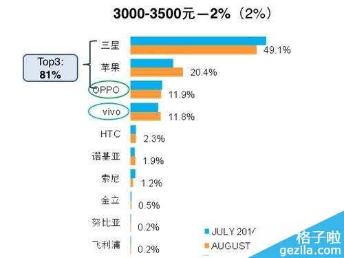 抛开苹果高大上的精品路线不说,8月份表现最为抢眼的是vivo、oppo、小米三家厂商,在国际品牌份额降低的时候逆势上涨。其中,vivo以增长0.7%成为最抢眼的手机品牌。vivo与华为的距离缩小到1.1%,并且手机均价达到了1522元,已经开始进入中端手机行列。