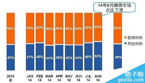 另外值得注意的一点是,8月份捆绑市场(合约机)比例有所松动,目前与开放市场(普通裸机)市场持平,各占50%,这主要是受到运营商补贴降低的政策影响。据悉,国资委要求中国移动、中国联通营销费用大幅消减20%,而且是3年内连续降低。根据测算,仅中国移动一家,3年里就需减少营销费用240亿元,三大运营商3年总计需要减少营销费用400多亿元。而手机补贴额度也将下调100亿元,并且3年内手机成本补贴降至0。未来捆绑市场还将会进一步下滑,开发市场将会迎来新的机会。