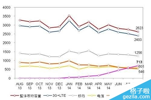 中国人2G-3G走了十几年,但是3G-4G却只走了不到五年。自从移动4G率先发放以来,4G手机开始成为旗舰产品的标配。从GFK的数据可以看出,4G手机在运营商的大力推动下开始放量,环比增长20%多。从目前的产品开卖情况来看,上游高通、MTK、展讯已经完成了4G LTE网络的部署。其中移动TDD和联通的FDD,都将会在2014-2015年进行大规模的基站升级。届时,二线三线城市将会完成一次4G手机的普及风暴,因此,手机销量仍然会继续攀升。预计未来运营商会形成“4G为主,3G为辅”的策略,而2G网络将基本淡出舞台。