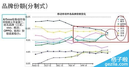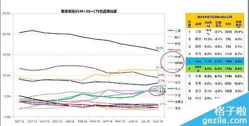 先说数据来源,GFK来自德国,是全球五大市场研究公司之一,拥有80年的历史,在业内确立了绝对的专业性权威地位。此次数据是2014年8月份智能手机的线下渠道检测数据。从此次数据中,我们可以看到不少的趋势性变化: