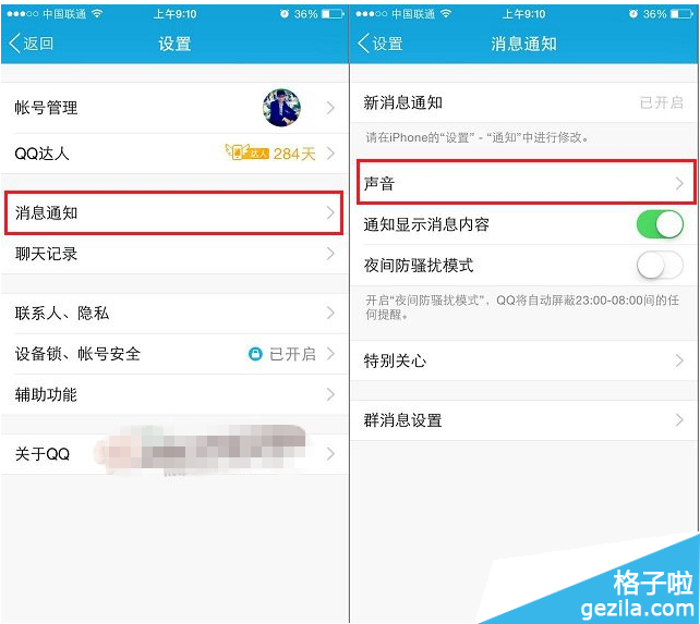 二.进入手机QQ设置后,点击进入“消息通知”设置,然后再进入“声音”设置,如下图所示。