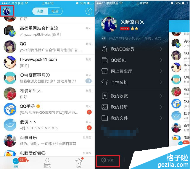 一.首先打开手机QQ,然后点击左上角的个人“头像”,在打开的界面中,点击进入左下角的“设置”,如下图所示。