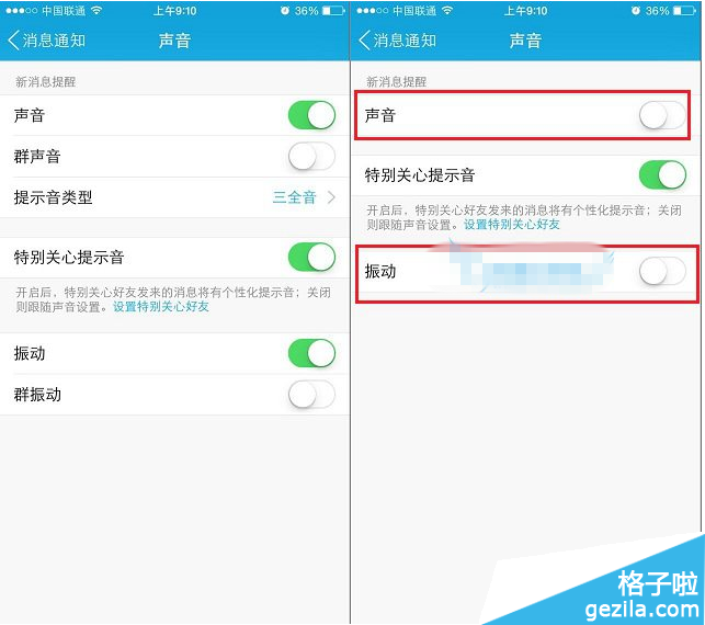 三.在QQ消息通知的“声音”设置中,我们将“声音”和“振动”关闭就可以了,如图所示。