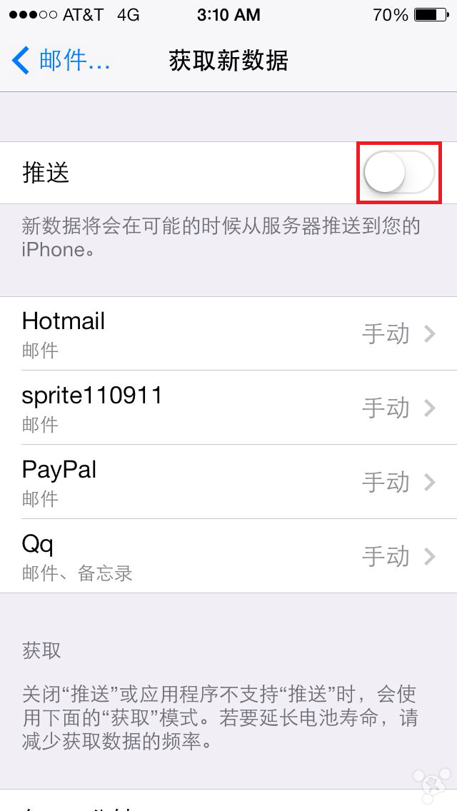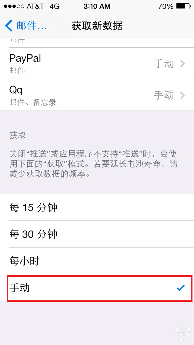 通过手动方式来获取最新邮件,可以避免系统自动后台获取从而达到省电目的。