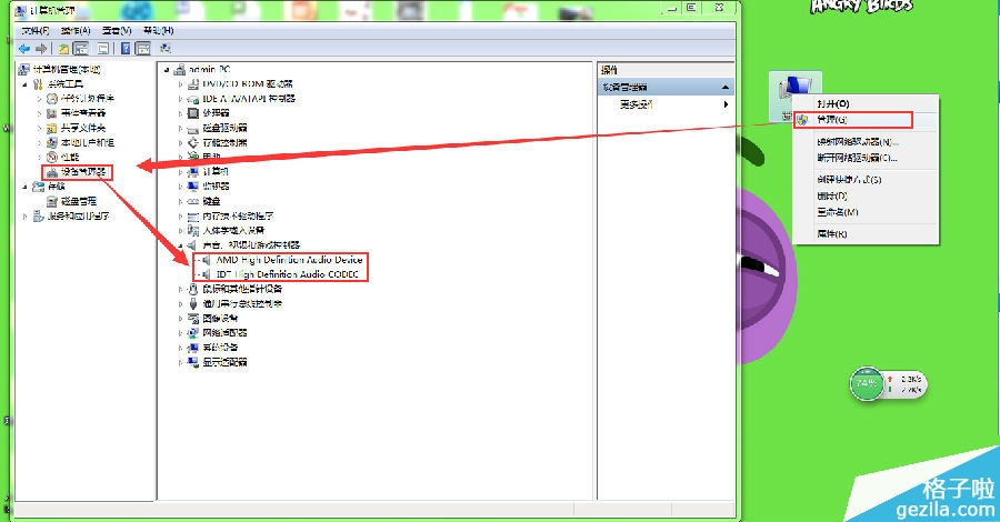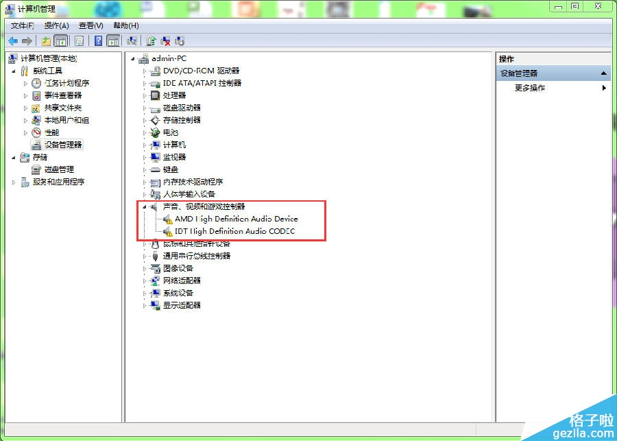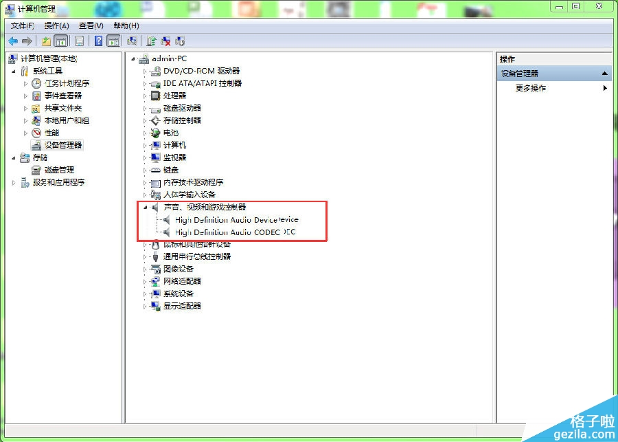 打开计算机——点击管理——点击设备管理器——查看声音、视频和游戏控制器。检查声卡在设备管理器中有没有被禁用(如图)